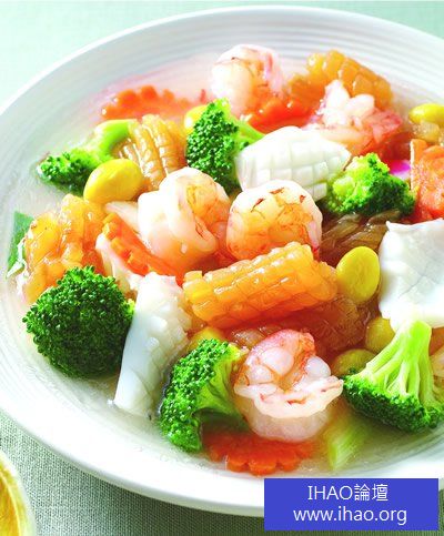 2.將青花椰菜切小朵洗淨,再依序與紅蘿蔔片、白果和作法1的蝦仁、花枝片、魷魚片放入滾水中汆燙至熟後,分別撈起備用。