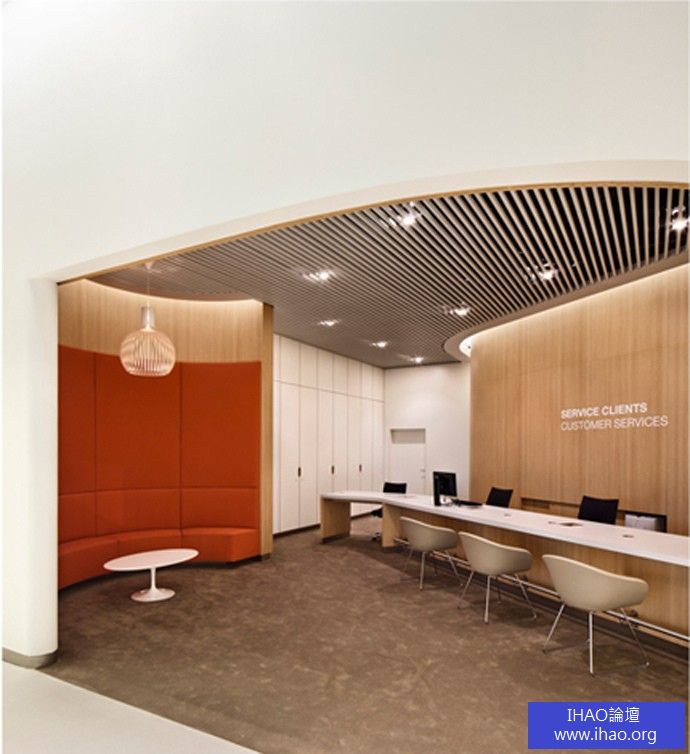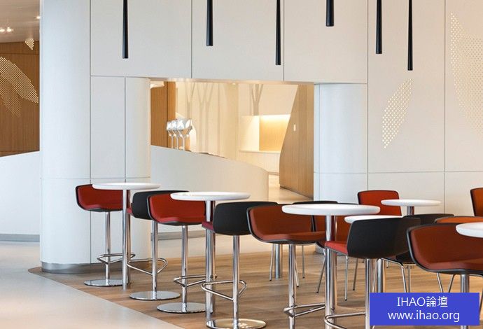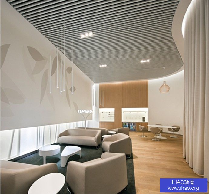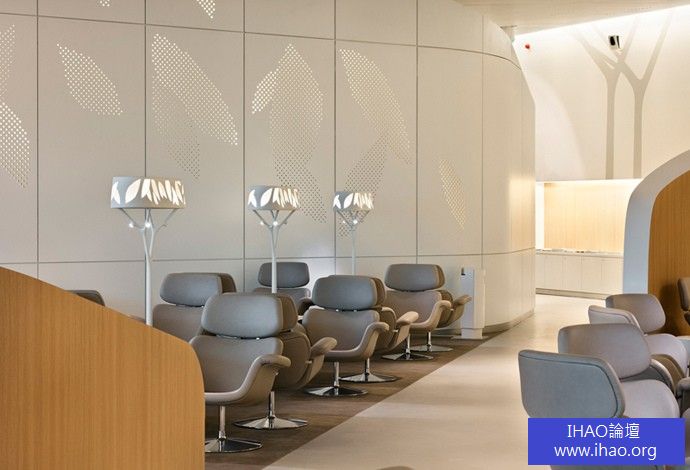 聰明的讀者一定有發現在這間貴賓室裡的牆壁裝飾或是燈座造型都巧妙地以森林為基調設計,讓使用者完全無感的融入到看似高科技感的空間中。