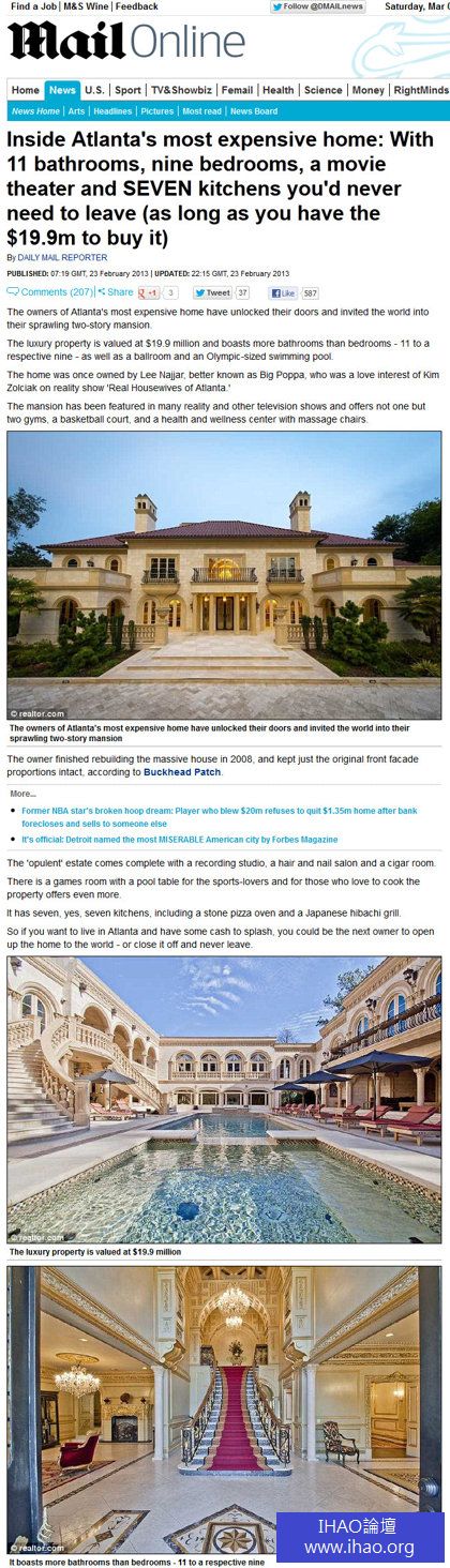 這間豪宅的地點就位於美國亞特蘭大,當地有不少名人都住這,不過根據英國每日郵報報導這1間,可是當中最貴的,除了有7間廚房、11間浴室、9間臥室,雪茄室、酒吧、游泳池、籃球場應有盡有,設備暨豪華又齊全,還上過電視節目,雖然豪宅能滿足住戶方位需求,甚至可以不用出門,但若真想住進去,可還得付得出這千萬美金的天價。