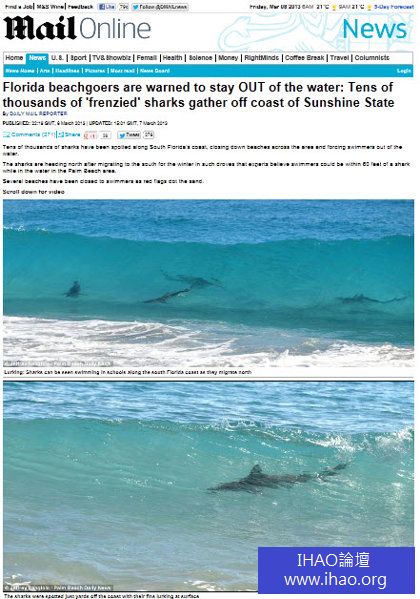更靠近的特寫畫面,讓觀眾可以更清楚看到海裡的大魚不是普通魚類,而是讓人聞之喪膽的鯊魚,佛州南部海域突然出現上萬條鯊魚,為了保護民眾及泳客安全,當局立刻關閉沙灘,禁止下水。民眾:「民眾真的需要聽從相關警告,感謝上帝,幸好有這些警語。」民眾:「這是個公共沙灘,這裡有救生員還有相關警語。」
