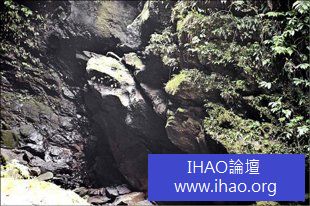 這塊岩石從夾壁延伸出來,呈細長狀,近看就像一條大蟒蛇的蛇頭,躲在暗處,伺機獵食;若從遠處觀看,與上方的另1塊橢圓形岩石組合起來,又像是1隻在洞裡喝水休息的大烏龜。