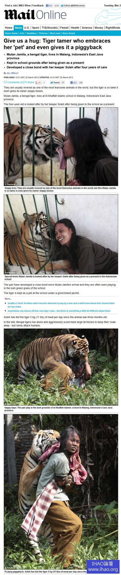 印尼東爪哇省有位名叫Soleh的女子,飼養了一隻老虎當作寵物,彼此間的感情相當親密,Soleh除了每天照顧牠的飲食外,還會有「擁抱」、「喇舌」的大膽行為出現。