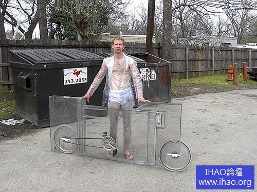 另外,為了和透明的腳踏車來搭配,Jimmy Kuehnle 還身穿一身透明的衣服、褲子 (還好內褲不是透明的) 來當作車衣。但詭異的地方是他還另外自製了一頂 (應該說是一坨) 又大又詭異的安全帽,讓他整個看來就是超級顯眼,但這樣不就和隱形的本意完全背道而馳了嗎?
