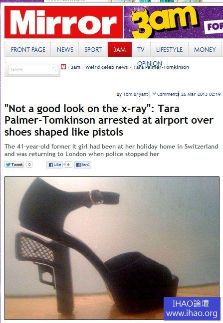英國一名曾經當過模特兒的女子派瑪湯金森,先前從瑞士準備搭機回倫敦時,在蘇黎世機場的海關被擋下來,因為她腳上就穿著這麼一雙手槍高跟鞋,最後花了7個小時解釋,員警才放行,其實這雙名牌手槍高跟鞋,不是想買就有,樂壇天后瑪丹娜就有一雙,也曾經公開穿上手槍高跟鞋亮相過。