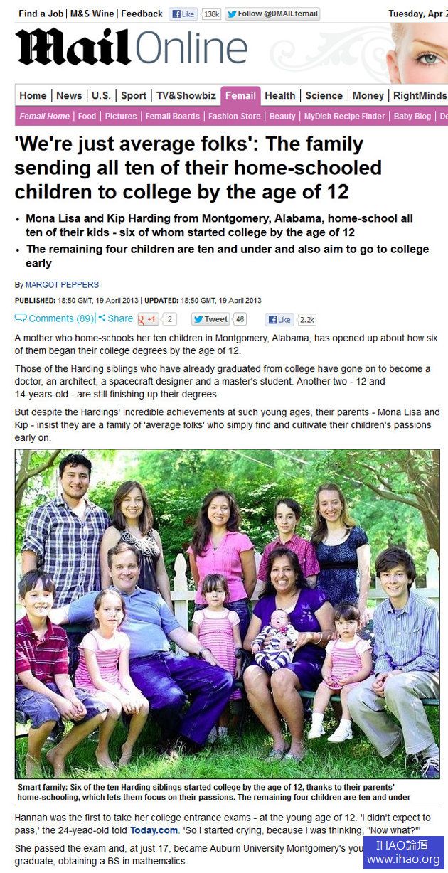 美國阿拉巴馬州蒙哥馬利市的蒙娜麗莎和吉普‧哈丁夫婦共生養10個孩子,令人稱奇的是,他們竟然將這10個孩子全培養成了神童,儘管10個孩子沒有上過一天中小學,從小都是在家接受母親蒙娜麗莎教育,但最年長的6個孩子竟然全都在12歲前入讀大學,而最小的4個孩子也聰明過人,準備12歲時考大學!日前,蒙娜麗莎寫了一本名為《12歲前上大學》的新書,披露她和丈夫的教子之道。