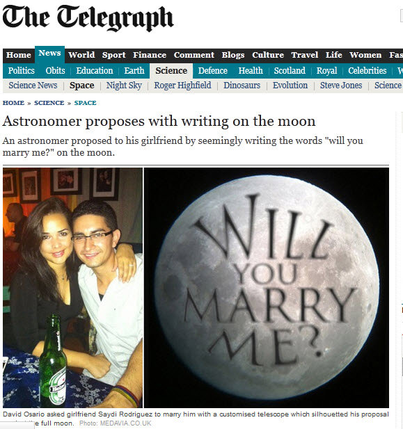 加拿大一名二十七歲的業餘天文學家歐薩里歐耍了點小技巧,在月球表面寫下「願意嫁給我嗎」向二十六歲的女友羅德里格茲求婚。